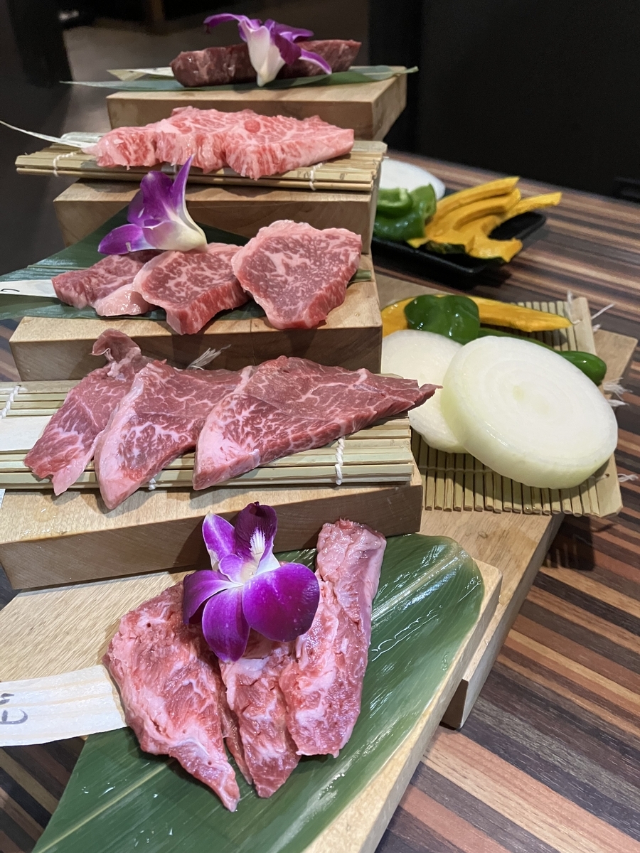 「五段盛」というメニューを注文する。何が五段かと思ったら特殊な階段状の板が出てきて、分厚い肉が一段ずつ鎮座している。2年前に狂喜したほどのお得感はややなくなっているものの、東京で注文するよりはるかに安い。これで2400円とかだった。
