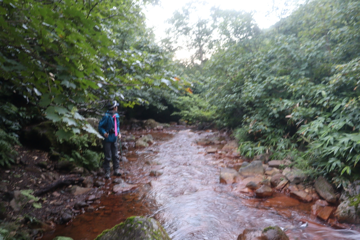 この時点で軽い沢登り。マークはたくさん付いているけど、なかなか本州のルートではお見かけしない。『日本百名山』によるとこの沢はアイヌの言葉で魚のいない沢という意味らしく、確かに沢底は茶色で魚影はない。
